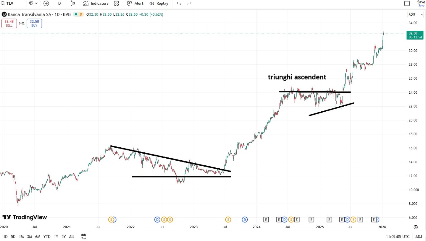 Acțiunile Banca Transilvania (TLV) au consolidat in primele cinci luni ale anului intr-un tipar bulish numit steag. La sfarsitul lunii Mai 2025 pretul a spart in sus, si de atunci tendinta ramane crescatoare.