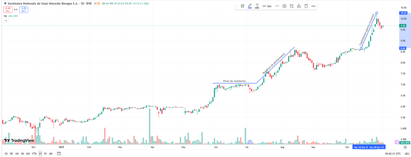 Prețul acțiunilor Romgaz a crescut dramatic în ultimul an, dublându-se față de aceeași perioadă a anului trecut datorită unui mix de factori: rezultatele financiare comunicate în iulie 2025 și emiterea de obligațiuni corporative pentru investiții strategice. Anunțul succesului capitalizării pentru investiții, care includ finalizarea Neptun Deep, a dus la o probabilă supraevaluare a prețului acțiunilor.