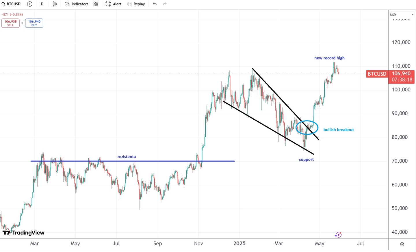 Mai mult, dupa bullish breakout care a urmat, prețul a depășit nivelul inregistrat in dublul top anterior. Astfel, putem vorbi de inceperea unui nou trend ascendent, atata timp cat prețul Bitcoin nu coboară sub $70.000.