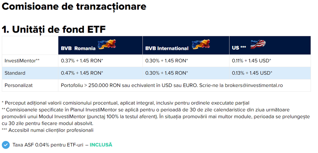Prin programul InvestiMentor, comisionul de tranzacționare scade pentru acțiuni la 0.37% + 1.45 RON pe BVB și 0.11% + 1.45 USD pe US timp de 30 de zile. Taxa ASF (0.06% pentru acțiuni și produse structurate, 0.02% pentru obligațiuni, 0.04% pentru ETF-uri) este inclusă. Cele 12 module oferă un maximum de 360 zile de comisioane reduse.