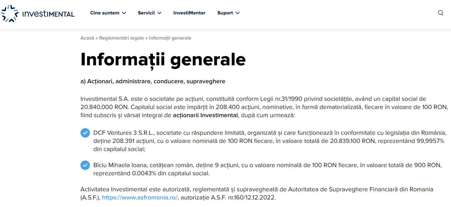 Investimental este o platformă de investiții online reglementată de ASF, autorizație A.S.F. nr.160/12.12.2022. Brokerul este condus de Mihaela Bîciu, cu o experiență de peste 20 de ani în piața de investiții din România. În 2001 a preluat funcția de manager executive in Tradeville si are experienta ca membru al board-ului director atât in Tradeville cât și la Bursa de Valori București (BVB).