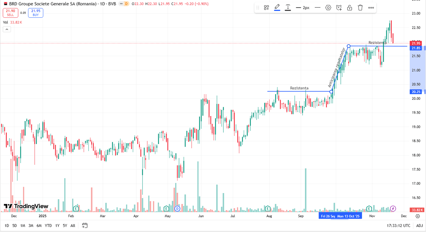 Acțiunile BRD Groupe Société Générale au avut un tipar tipic pentru piața românească. Rezultatele financiare favorabile, alimentate de dobânzi în creștere și creditarea de către BRD a statului român prin titluri de stat și împrumuturi pentru Ministerul de Finanțe sunt reflectate în prețul acțiunilor. Inflația din România, împreună cu rezultatele financiare, au dus la o creștere nominală de 22%.