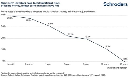 Timpul limitează riscul investițiilor. Și nu o spun eu, ci diferite studii. Acest grafic de la Schroders rezumă exact posibilitățile de a suferi pierderi în acțiuni în funcție de timpul în care rămâi investit (și totul ajustat la inflație).