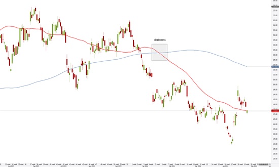 Death Cross este un termen folosit în analiza tehnică pentru a identifica o tendință bearish pe piețele financiare. Este formată din două linii de tendință unde prețul unei linii de tendință pe termen scurt (o medie mobilă) trece sub o linie de tendință pe termen lung, semnalând o posibilă tendință bearish.