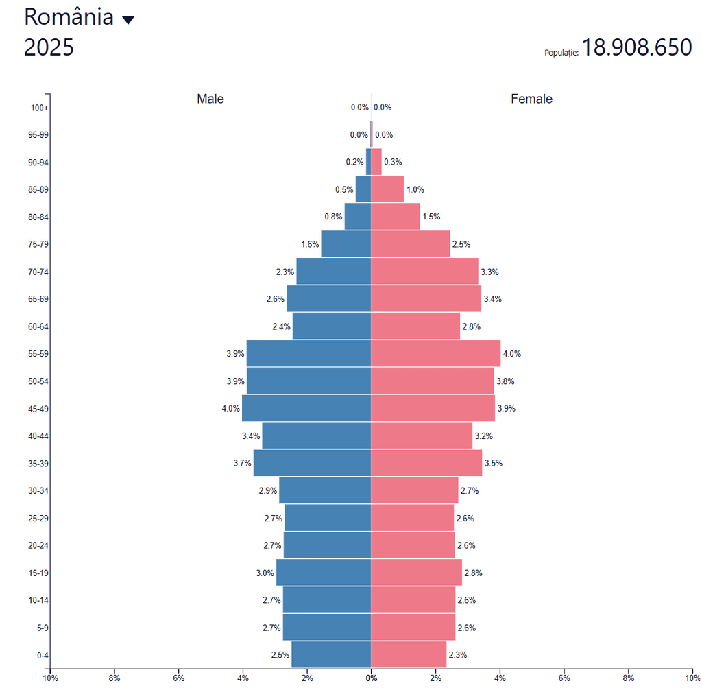 La 1 ianuarie 2025, populația rezidentă a României a scăzut la 19,036 milioane, cu un indice de îmbătrânire ajuns la 130 de vârstnici la 100 de tineri (0–14 ani). Ponderea populației 65+ a urcat la 20,3%, în timp ce grupa 0–14 a coborât la 15,6%, confirmând un profil demografic tot mai ”constrictiv”. Deși balanța migrației a fost pozitivă (immigranți > emigranți cu ~58,800 persoane în 2024), aceasta nu a compensat sporul natural negativ (~–102,000 persoane).