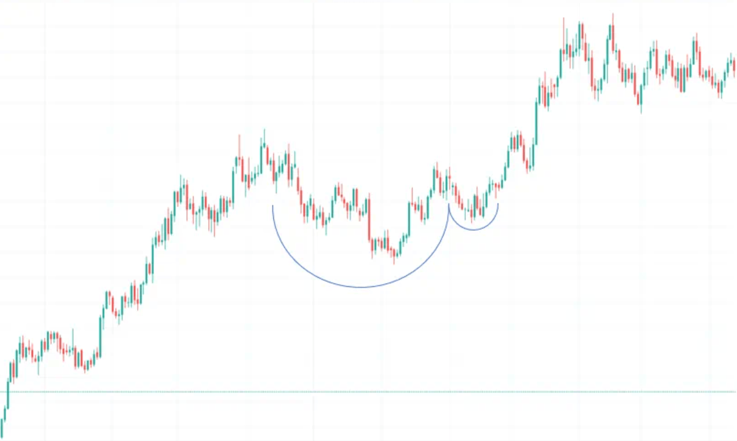 Pentru a explica mai în detaliu, această formațiune apare atunci când un activ, după atingerea unui minim, îți inversează scăderea. Aici se formează ceașca. În acel moment, pe măsură ce prețul consemnează noi maxime, este probabil ca investitorii care au cumpărat anterior la acele niveluri să înceapă să vândă. Astfel, aceștia ies din poziție înainte ca activul să poată cădea din nou.