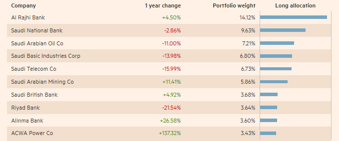 Acest ETF reproduce indicele MSCI Saudi Arabia 20/35 care acoperă 85% din piața locală, cu un plafon maxim pentru cea mai mare poziție de 35%, iar restul companiilor la 20%.