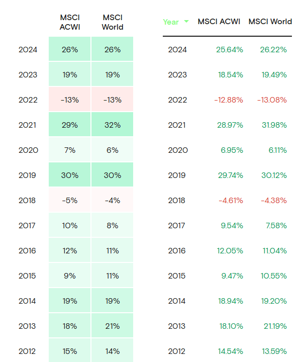 Se poate spune că MSCI World reprezintă aproximativ 88% din MSCI ACWI și acoperă aproximativ 85% din totalul oportunităților de investiții în acțiuni la nivel mondial.