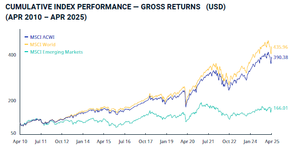 Mulți investitori cred că, investind într-un indice global, ar profita deja de toată creșterea mondială. Realitatea este că acest lucru nu este adevărat. De aceea, când căutăm expunere în aceste țări, trebuie să o completăm cu alți indici, cum ar fi un indice al țărilor emergente.