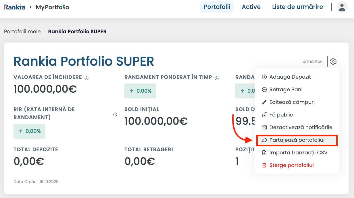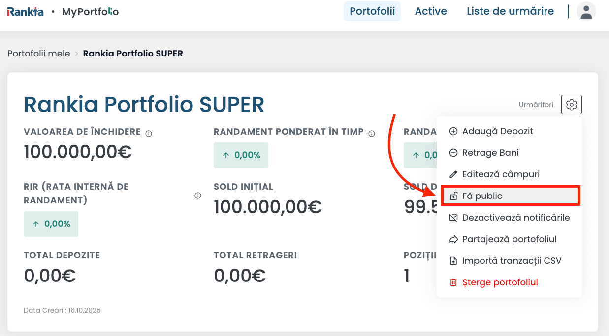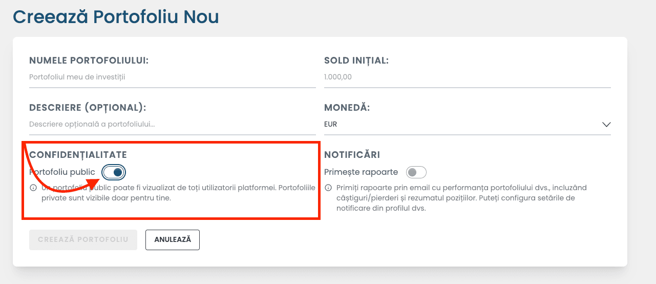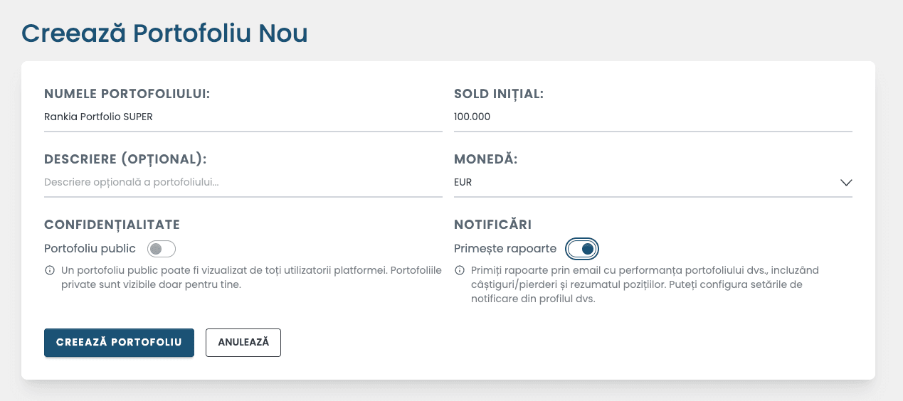 După ce completezi câmpurile, confirmă crearea portofoliului. Acesta va fi disponibil imediat, cu soldul inițial înregistrat, iar toți indicatorii, randament, depozite și retrageri, vor începe de la zero.
