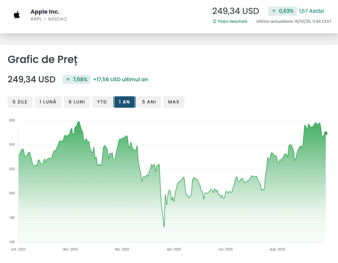 Selectează piața, indică numărul de unități (ex.: 4 acțiuni) și data tranzacției. Prețul și cursul valutar vor fi completate automat cu valorile aferente zilei selectate. După confirmare, tranzacția va fi procesată, iar impactul va fi reflectat imediat în graficul de evoluție al portofoliului tău.