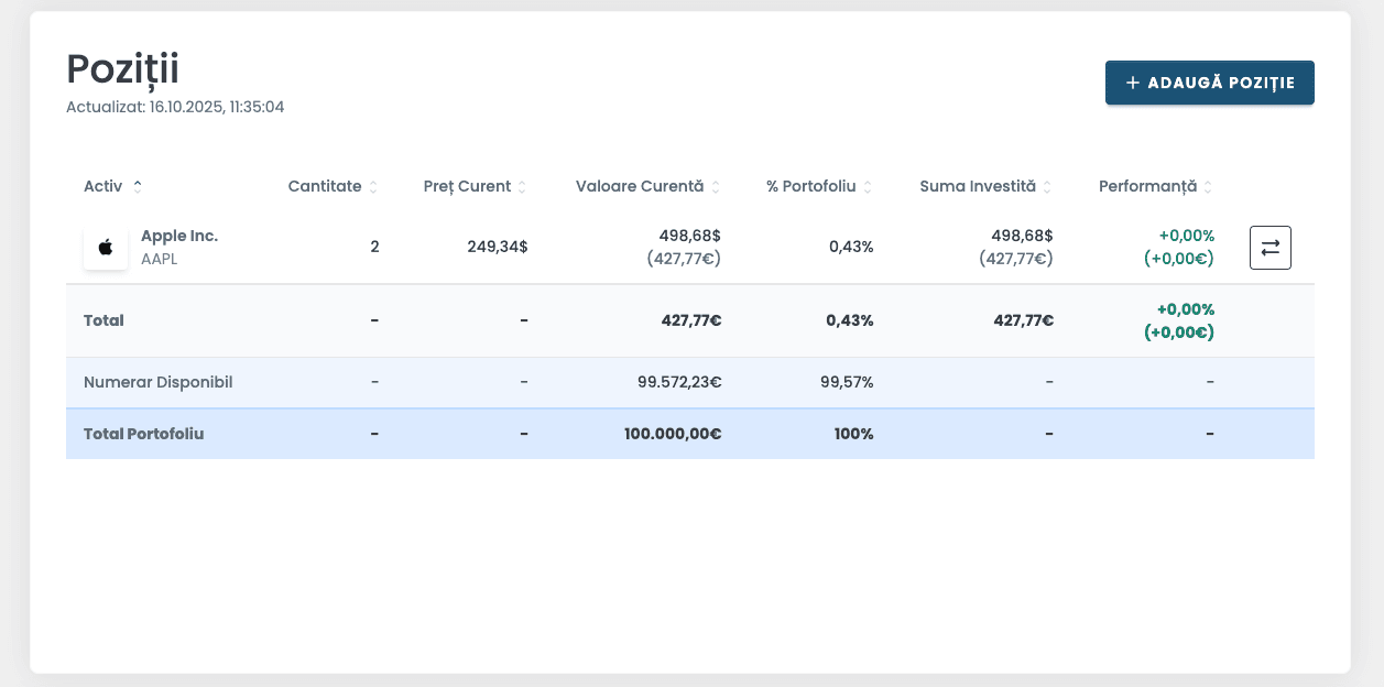 Pentru a începe activitatea în portofoliul tău, poți efectua o primă achiziție de acțiuni sau ETF-uri. În secțiunea „Poziții”, dă clic pe „Adaugă poziție” și caută activul pe care dorești să îl achiziționezi, de exemplu, Apple.