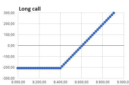 În cazul unui long call, prima inițială este 207 și prețul de exercițiu este 8400:
