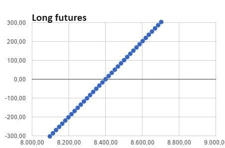 Rezultatul long futures = Prețul activului de bază - Prețul viitor = 7560 - 8400 = -840 de puncte.