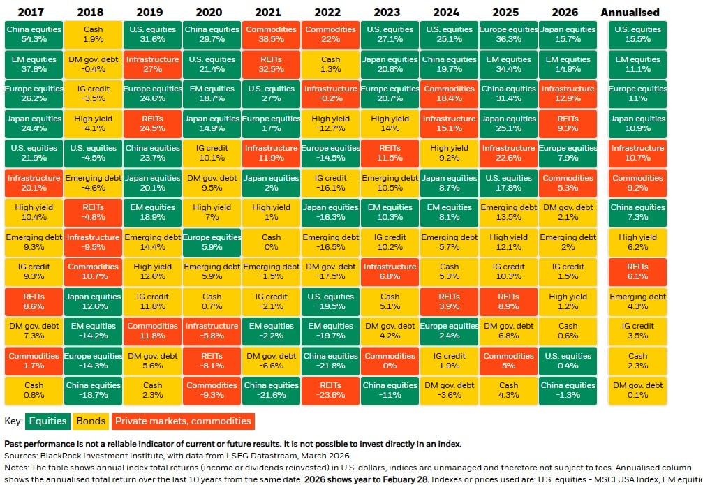 Dacă dorim să ne uităm în amănunt la ultimii 10 ani (până în martie 2026), putem vedea că piața de acțiuni din SUA a oferit un randament anualizat de 15,5%. În același timp, investiția în cash a fost cea mai puțin profitabilă.