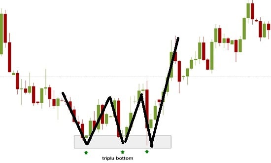 Triplul bottom apare de obicei la sfârșitul unui trend descendent și când este confirmat, indică schimbarea trendului într-unul ascendent. Se deosebește de dublul bottom prin faptul că este format din trei vârfuri de cotare în loc de două. Ceea ce se întâmplă este că prețul nu are suficientă forță pentru a continua să scadă. Practic, nu rupe nivelul celor două minime anterioare, ambele la același nivel de preț. Triplul bottom, odată ce a fost format, indică schimbarea trendului.